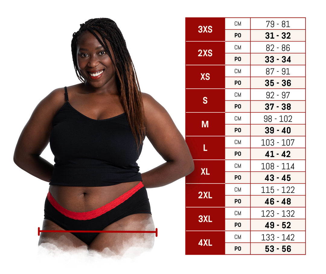 Attention : Nos culottes taillent plus petit que vos culottes régulières. Le tableau ci-contre est là pour vous guider, mais si vous hésitez entre deux tailles, nous vous recommandons de prendre celle du dessus pour un confort optimal.